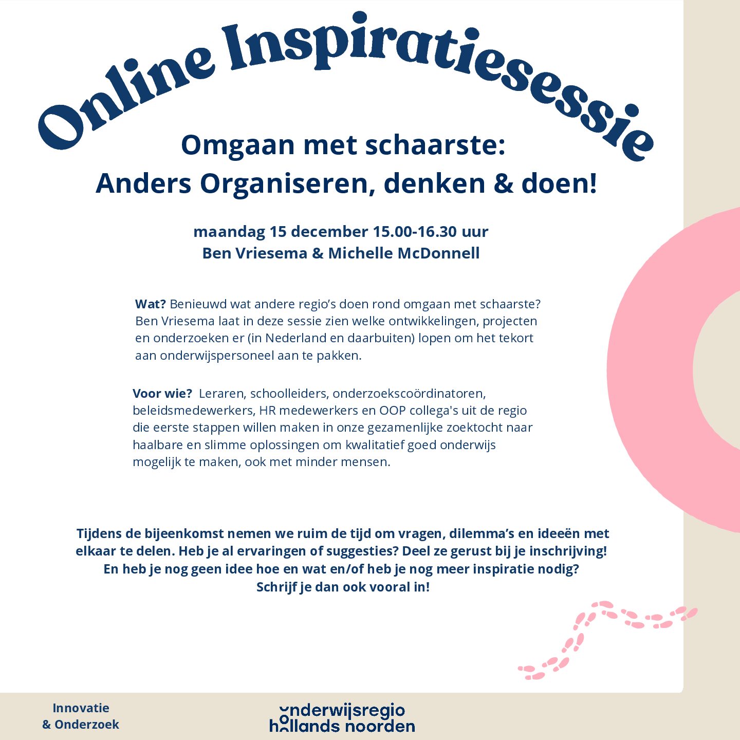 Leraren, schoolleiders, onderzoekscoördinatoren, beleidsmedewerkers, HR medewerkers en OOP collega’s uit de regio die eerste stappen willen maken in onze gezamenlijke zoektocht naar haalbare en slimme oplossingen om kwalitatief goed onderwijs mogelijk te maken, ook met minder mensen.