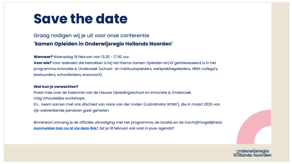De ROWF en AONHW nodigen je van harte uit voor de conferentie Samen Opleiden in Onderwijsregio Hollands Noorden. Voor iedereen die betrokken is bij dit thema.